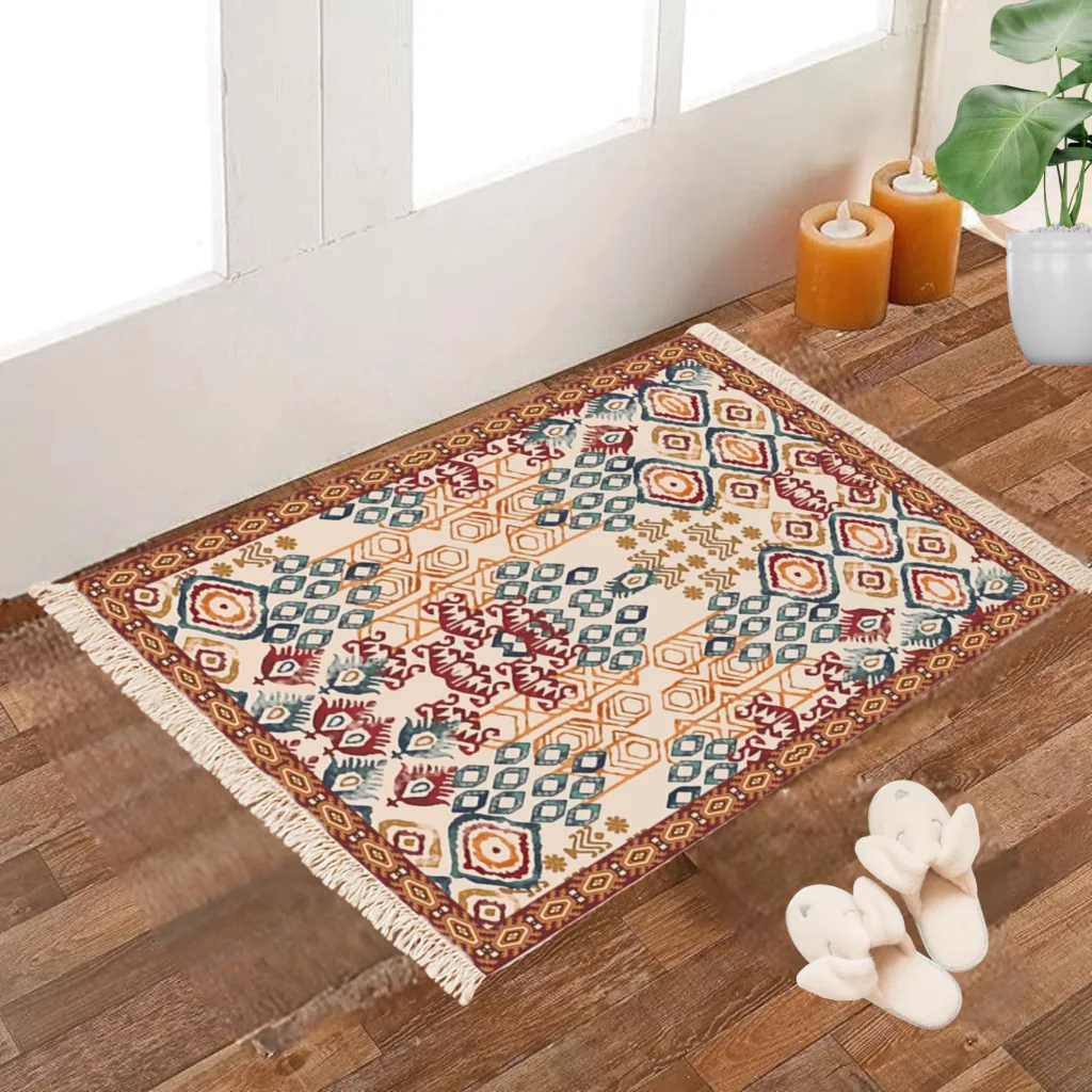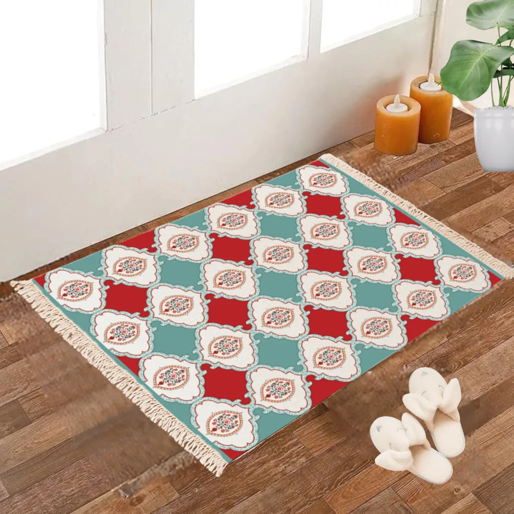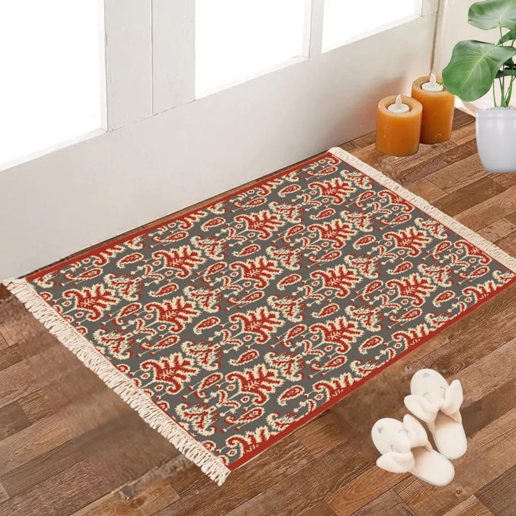 “Add a vibrant vintage vibe to your home with this beautifully crafted 2×3 feet Dhurrie Carpet Rug. Made with premium quality cotton fabric, this floor mat features a digitally printed tropical design that instantly uplifts the décor of your living area, bedroom, or study corner. The bright and eye-catching print brings warmth and freshness, while the traditional hand-knotted fringes on both ends add a touch of elegance and authenticity.