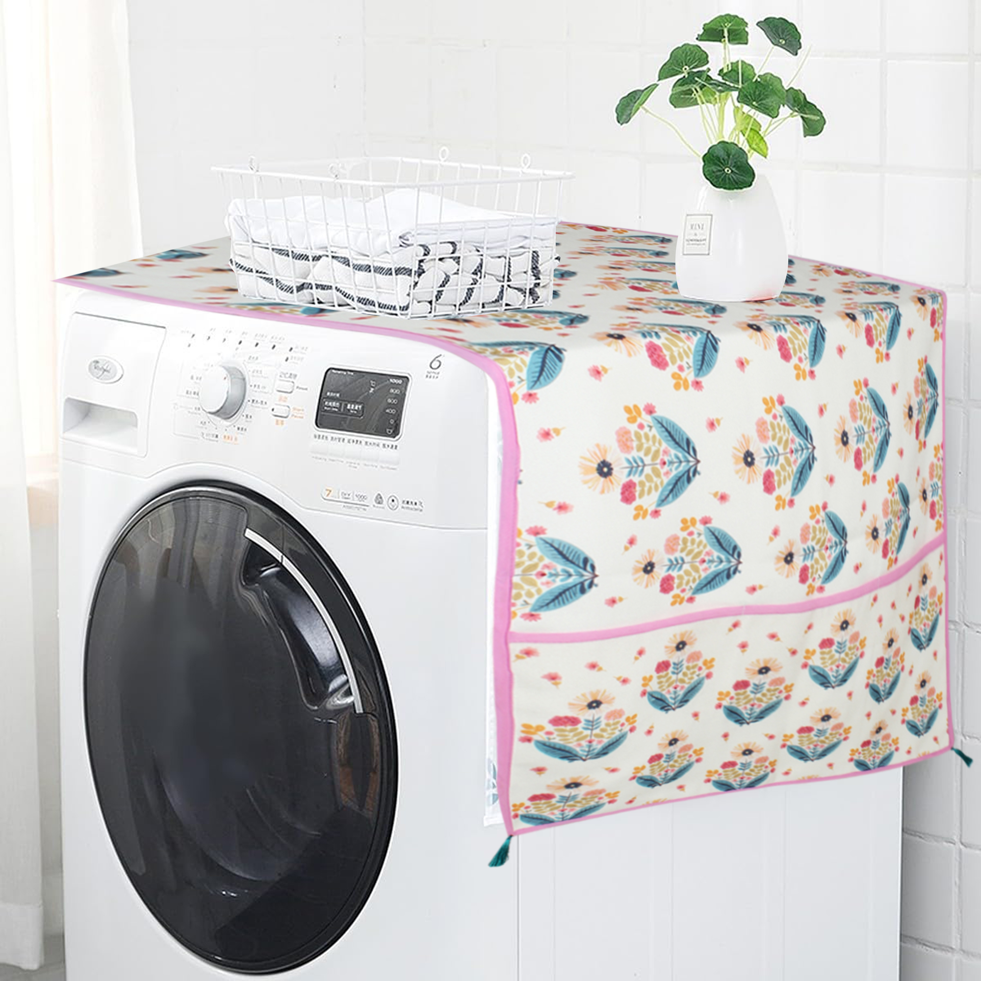 The cover includes multiple utility pockets on the sides, perfect for storing small kitchen essentials like gloves, scissors, or notes. Durable, easy to clean, and machine washable, it offers a practical and stylish solution for everyday kitchen organization.